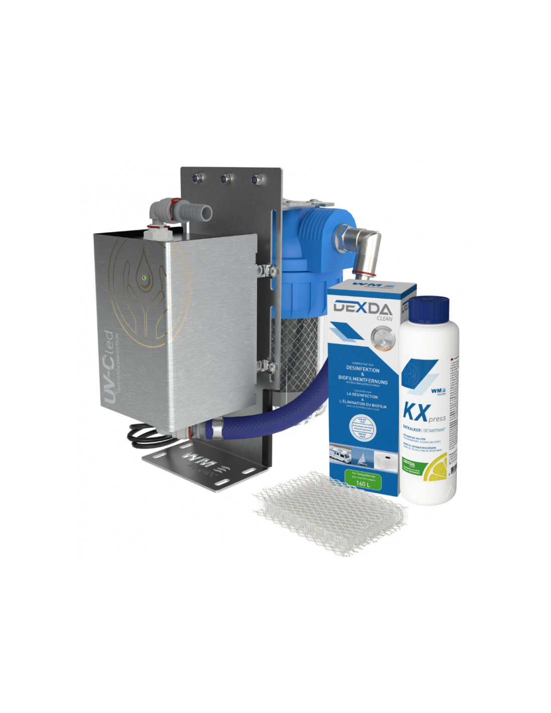 Kit WM AQUATEC pour la purification et la désinfection de l'eau potable (eau propre) en bateau, camping-car, van et fourgon aménagé. Pack avec pré-filtre à charbon, unité de désinfection écologique UV-C LED 12 V Biolite et support de fixation compact