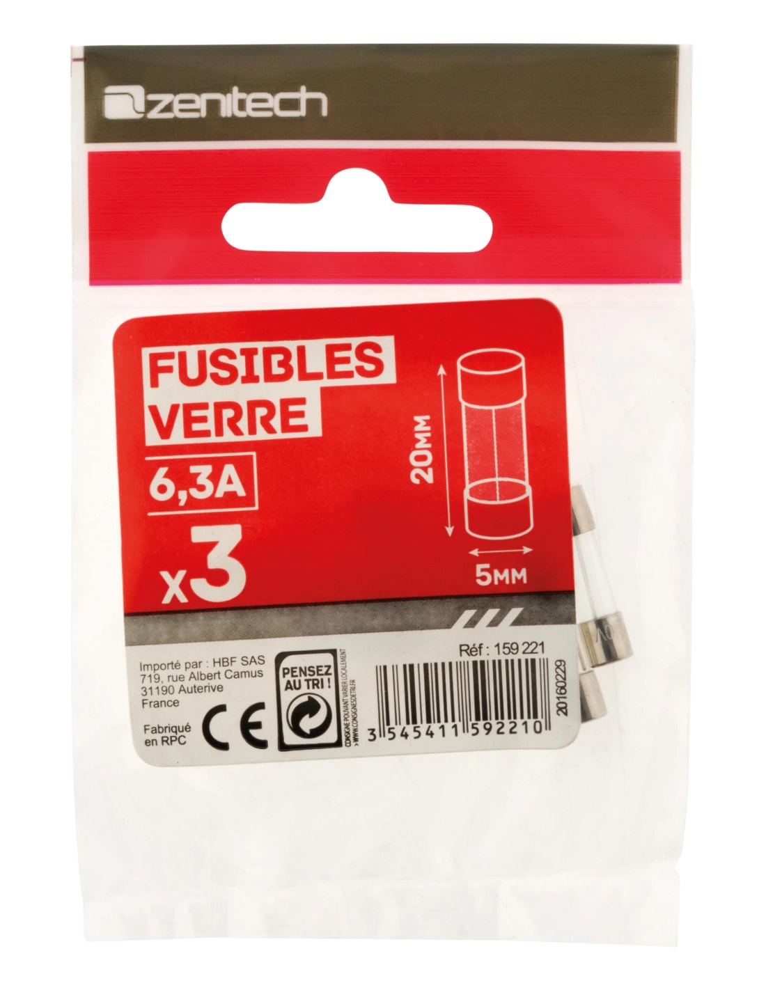 3 fusibles verre 5 x 20 mm 6,3 A - ZENITECH