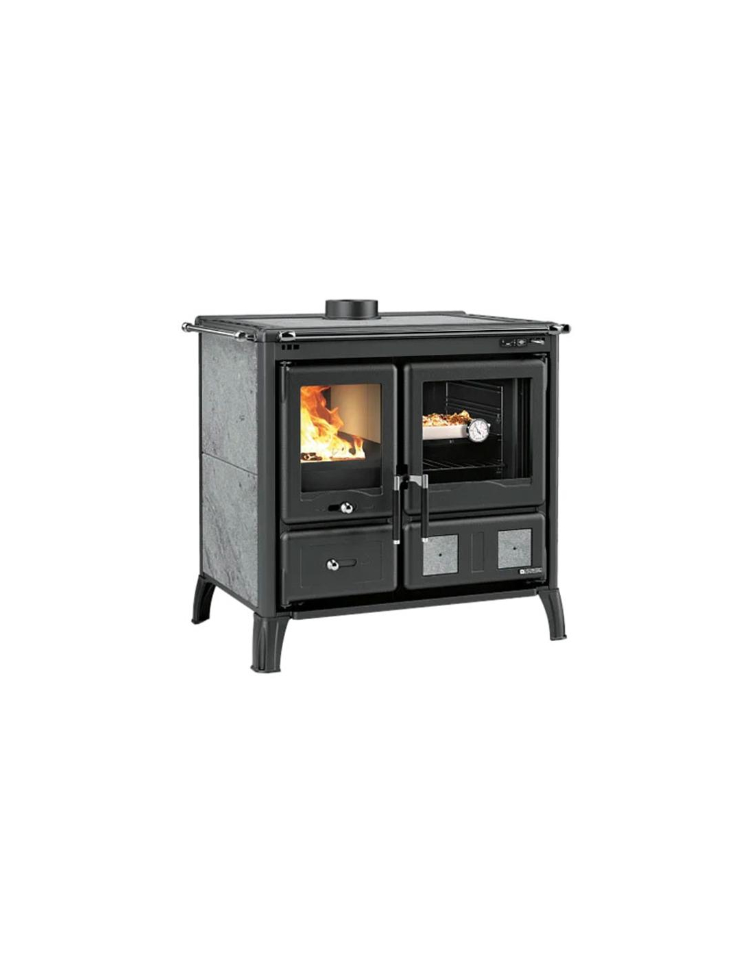 Cuisinière à bois sans bouilleurLargeur 95 cm - 9,5 kW-Rdt : 86 % - Bûches 30 cm - Portes vitrées - Anthracite + pierre naturelle Cuisinière à bois La Nordica Gardenia 16 Petra en fonte émaillée et pierre naturelle coloris Noir Antracite avec habillage en pierre – Corps de chauffe composé de parois réfractaires et d’un fond en fonte garantissant inertie et diffusion homogène de la chaleur – Fonctionnalités avancées : système d’air secondaire/tertiaire pour une post-combustion réduisant les émissions, vitre double verre avec parcours d’air préchauffé pour limiter l’encrassement, main-courante chromée, côtés ventilés en pierre naturelle, grand four de 55 l en acier émaillé porcelainé – Avantages pratiques : porte en fonte émaillée durable avec grand vitrage pour vision du feu, tiroir cuve pour cendres sous foyer, pieds en fonte émaillée pour stabilité, plaque et cercles en fonte polie pour cuisson de qualité, possibilité de raccordement à l’air extérieur pour combustion optimisée - Raccordement des fumées arrière ou dessus Ø 150 mm. Le prix indiqué comprend la TVA à 20%.