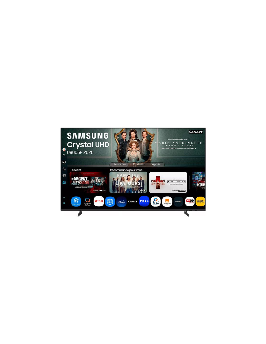 LED - 190 cm - 4K - 50 Hz - Crystal Processor 4K - HDR10+ VRR ALLM Q-Symphony - Tizen OS - Noir TV LED UHD 4K 190 cm Samsung TU75U8005FUXXC - Ce téléviseur Crystal UHD mise sur des couleurs riches et naturelles pour profiter pleinement des films, séries et grands événements sur très grand écran - La compatibilité HDR10+ et HLG apporte une luminosité éclatante et des contrastes plus intenses sur les contenus compatibles - La technologie UHD Dimming optimise les zones de l’image pour améliorer la profondeur des noirs et la précision des détails, avec un renfort Color Booster pour des teintes plus dynamiques - Le Crystal Processor 4K assure un traitement fluide et un 4K Upscaling efficace afin d’améliorer la netteté des sources non 4K, un vrai bénéfice pour la TV, le streaming ou les anciennes consoles - La Smart TV Samsung Tizen OS avec interface One UI 2025 donne accès à une navigation simple et à de nombreuses applications comme Netflix, Prime Video, Disney+ ou Samsung TV Plus, avec 7 ans de mises à jour annoncées - Pour le jeu, Motion Xcelerator et le mode jeu automatique avec ALLM et VRR réduisent la latence et améliorent la fluidité, idéal pour une console en HDMI - Le son 2.0 de 20 W profite d’Adaptive Sound et de Q-Symphony pour une écoute plus équilibrée, notamment avec une barre de son compatible - La télécommande universelle TM2240A simplifie le pilotage des équipements du salon - Son design noir sobre avec pieds Basic Feet s’intègre facilement dans un séjour moderne.