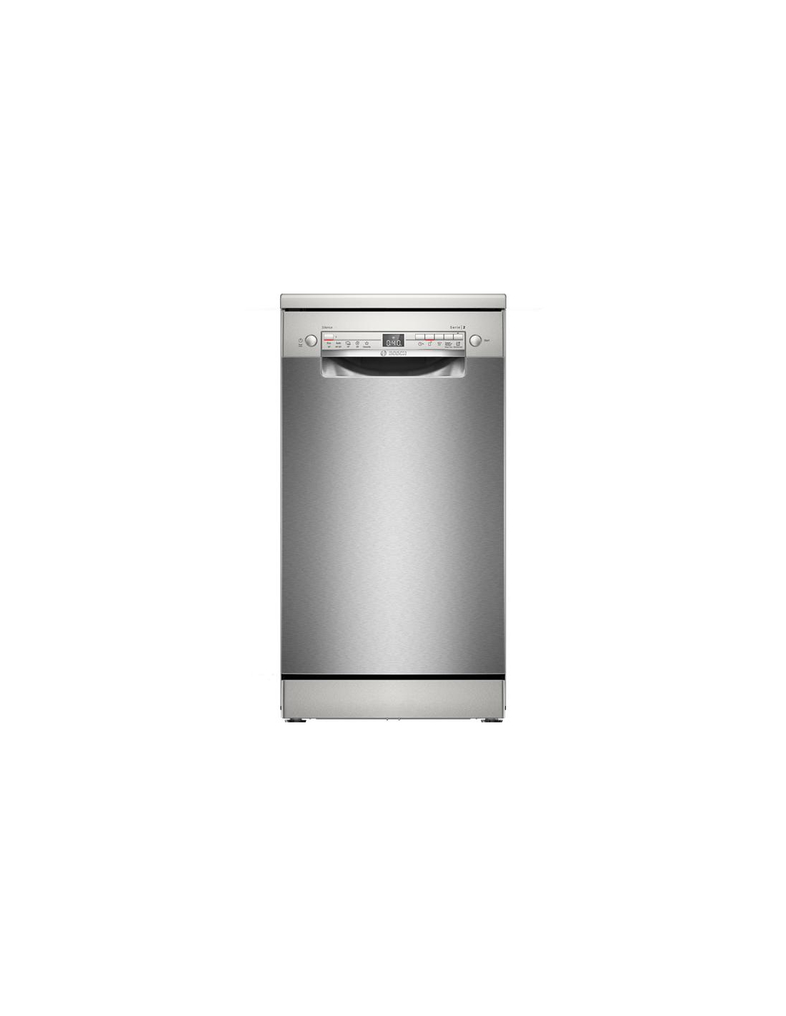 46 dB - 10 cvts - 5 prog - 3 opt - Tiroir à couv. - Connecté WiFi - L 45 cm - Acier brossé anti-traces Lave-vaisselle pose-libre Bosch SPS2HMI02E série 2 largeur 45 cm - Il propose 5 programmes dont Eco 50 °C, Auto 45-65 °C et Intensif 70 °C, ce dernier permet un lavage en profondeur des casseroles et plats très sales grâce à une température élevée - Les paniers Flex assurent une organisation modulable avec un panier supérieur réglable sur 3 niveaux grâce au système RackMatic même chargé, pratique pour adapter l’espace aux grands plats - Le tiroir à couverts Vario Slimline libère de la place dans le panier inférieur et améliore la qualité de lavage en séparant les ustensiles - La cuve inox garantit robustesse et meilleure tenue dans le temps face à l’humidité et aux cycles répétés - L’option Séchage Extra améliore le séchage des plastiques, tandis que l’échangeur thermique protège la vaisselle fragile et limite les chocs thermiques, bénéfice concret pour préserver verres et assiettes - Le système AquaSensor ajuste automatiquement la consommation d’eau selon le degré de salissure pour éviter tout gaspillage - Le départ différé jusqu’à 24 h et l’affichage du temps restant permettent d’optimiser l’organisation quotidienne - Connecté en WiFi via Home Connect, il permet de lancer, suivre et ajuster les cycles à distance avec une fonction silence à la demande pour s’adapter aux moments de vie - Le moteur EcoSilence Drive assure un fonctionnement discret, fiable et économe en énergie - Son coloris acier brossé anti-traces facilite l’entretien et limite les traces visibles - Finition acier brossé anti-traces.