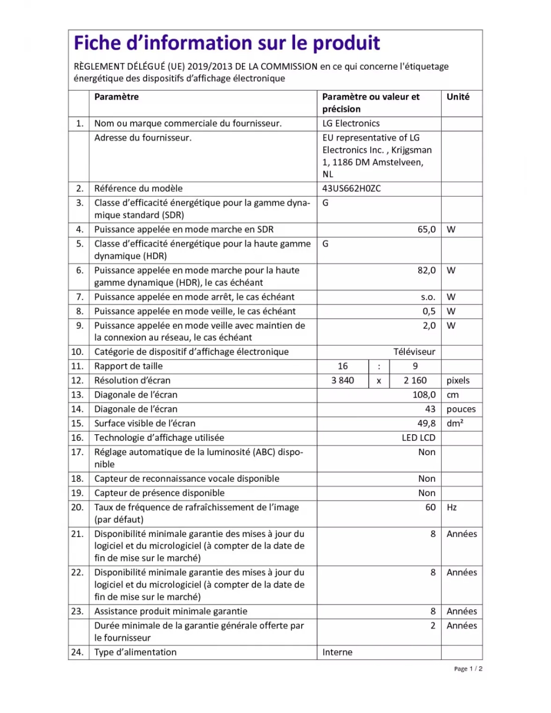 | Taille de l'écran (pouces) | 43 |