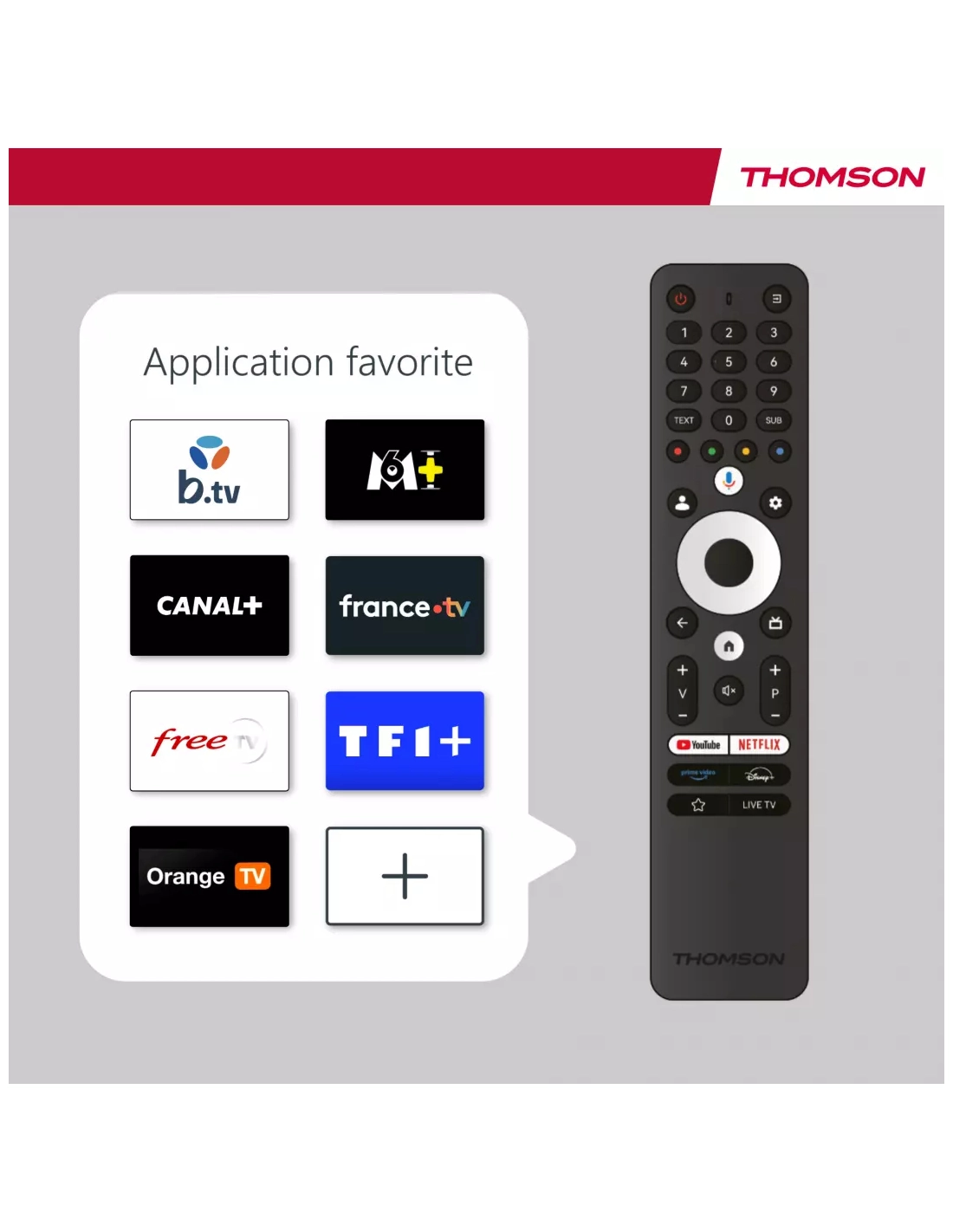 | Fonction(s) spéciale(s) Smart TV | Applications en accès direct sur la télécommande (Youtube, Netflix, Prime Vidéo, Disney+, Apple TV, Live TV) |