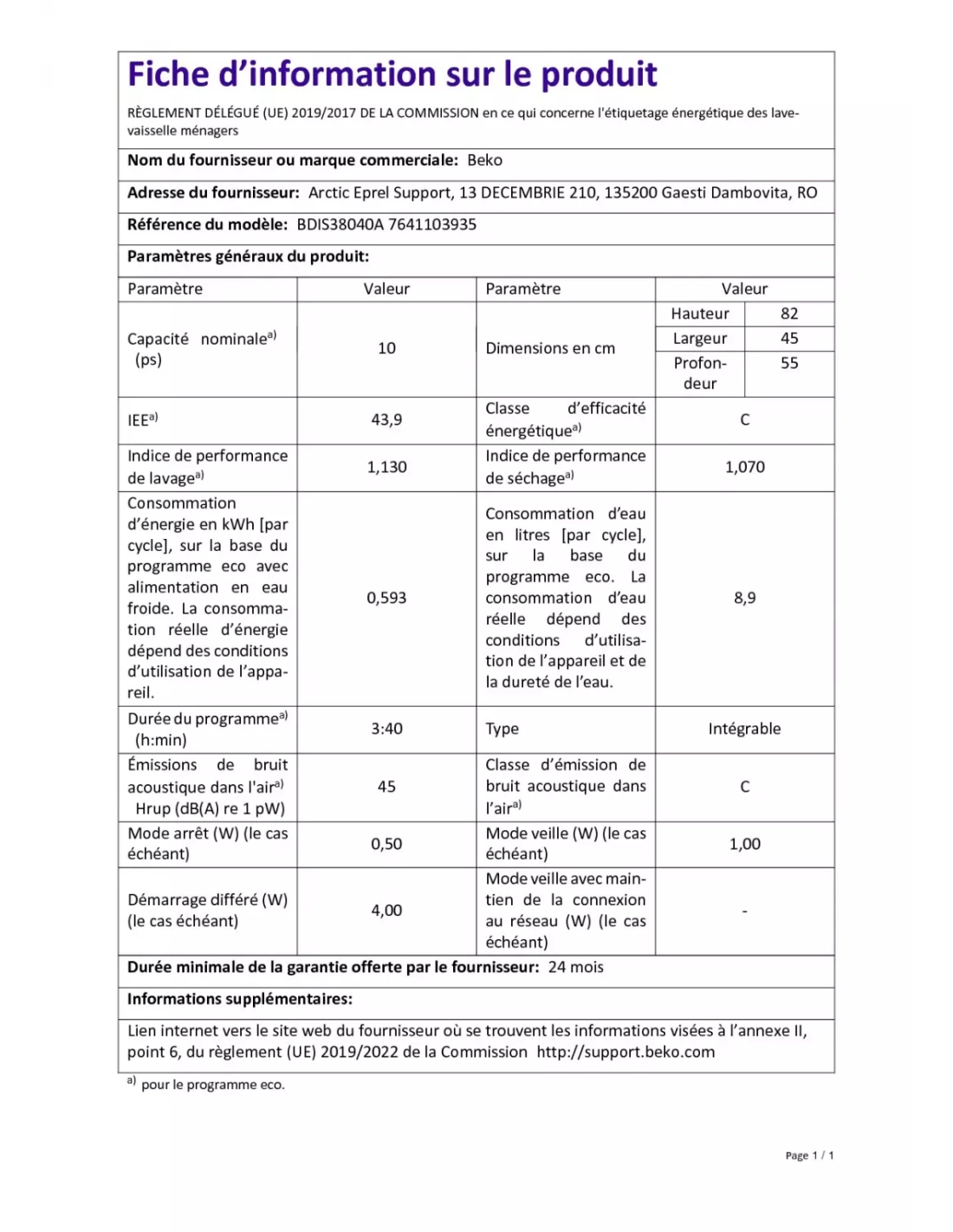 | Conso. d'énergie par cycle en programme éco (kWh) | 0.593 |