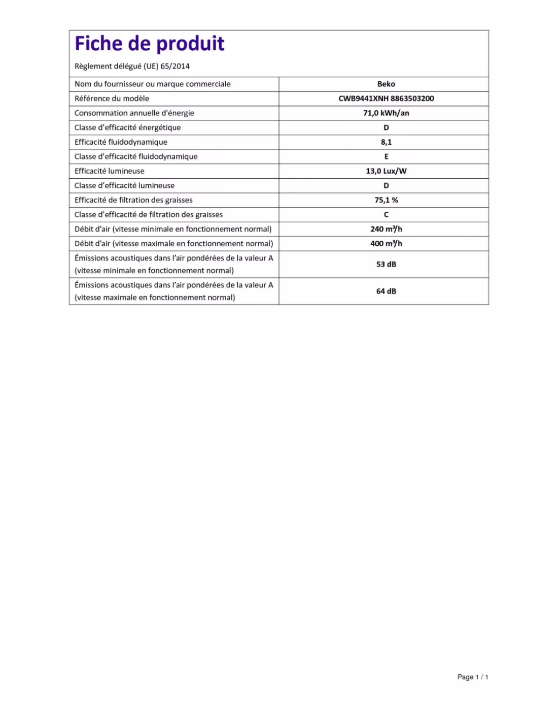 | Consommation d'énergie annuelle (AEC hotte) en kWh/an | 71 |