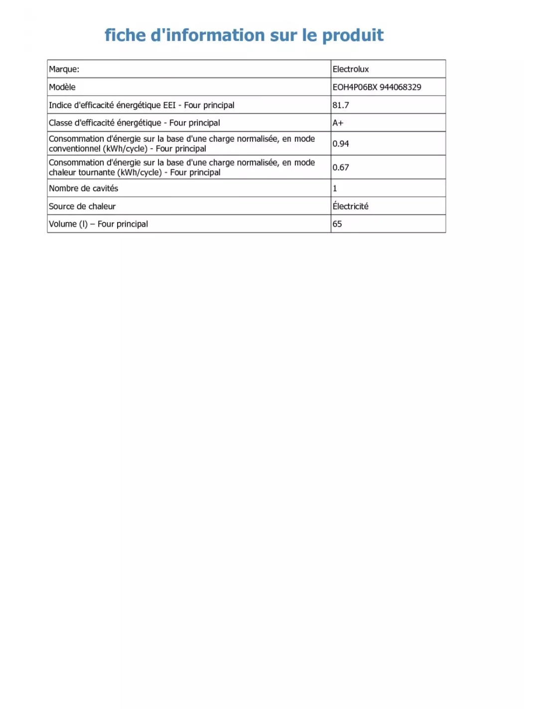 | Indice d'efficacité énergétique (EEI cavité entière) | 81.7 |