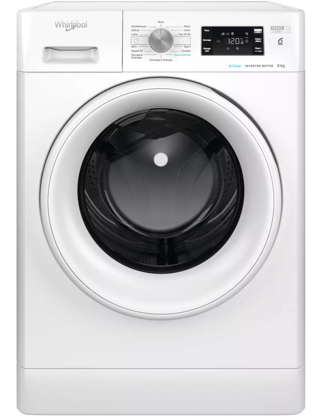 | Voyants / Affiichage | Déroulement du cycle, Robinet d'eau fermé, Nettoyage filtre, Appeler SAV, Porte verrouillée, FreshCare+ activé, Départ différé activé, Verrouillage des touches activé |