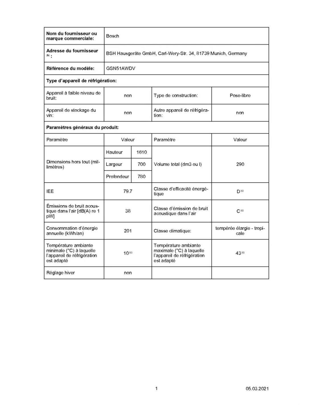 | Classe d'efficacité énergétique | D |