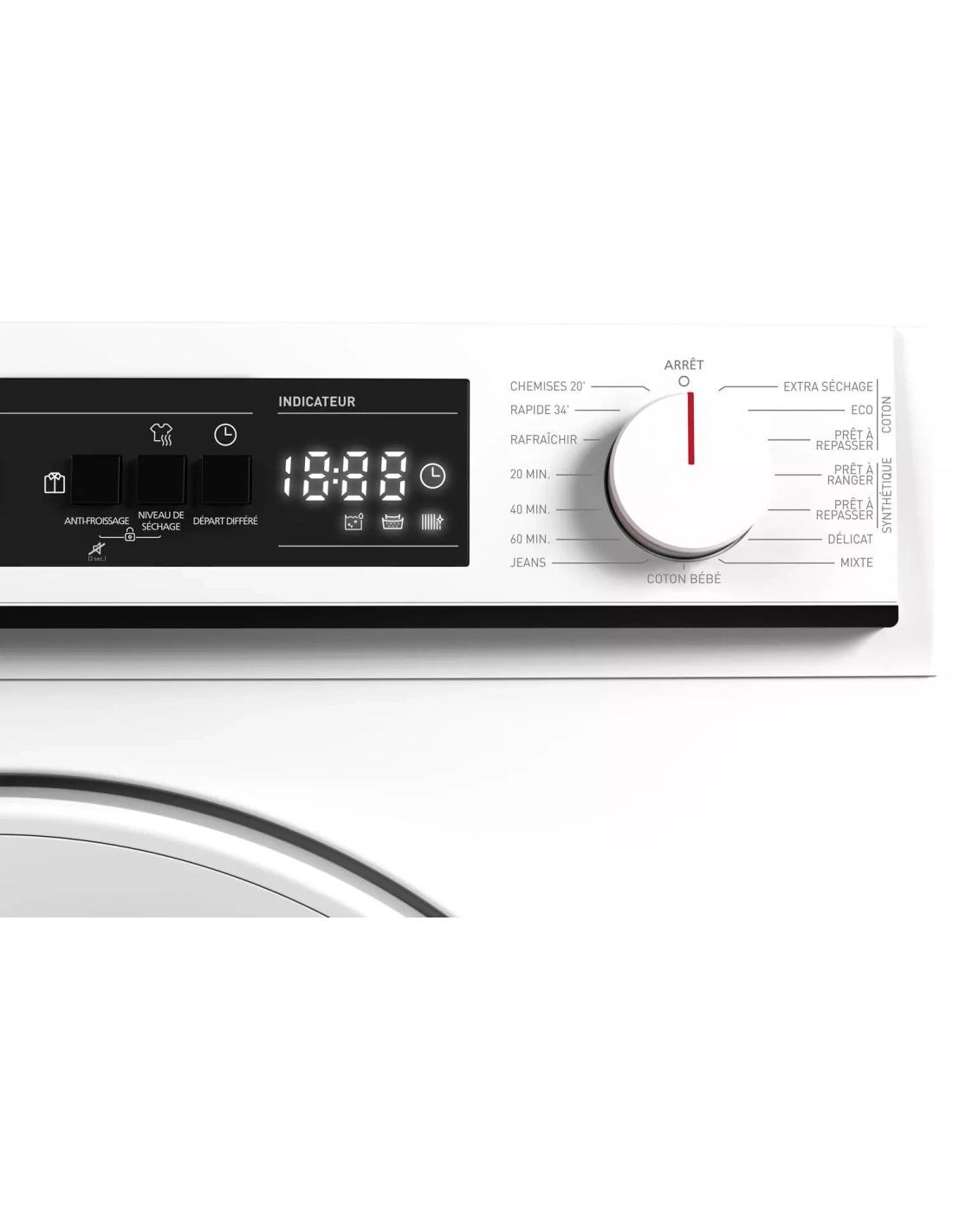 | Programmes spéciaux | Coton Extra Sec, Coton Prêt à ranger, Coton Prêt à repasser, Synthétiques Prêt à ranger, Synthétiques Prêt à repasser, Délicat, Mix, Coton Bébé, Jeans, 60 min, 40 min, 20 min, Rafraichissant, Express 34 min, Chemises 20 min |