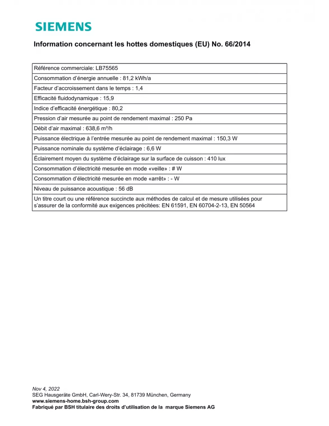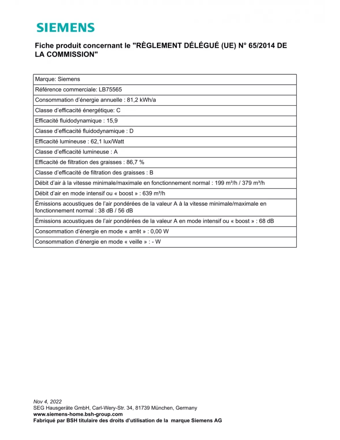 | Consommation d'énergie annuelle (AEC hotte) en kWh/an | 81.2 |