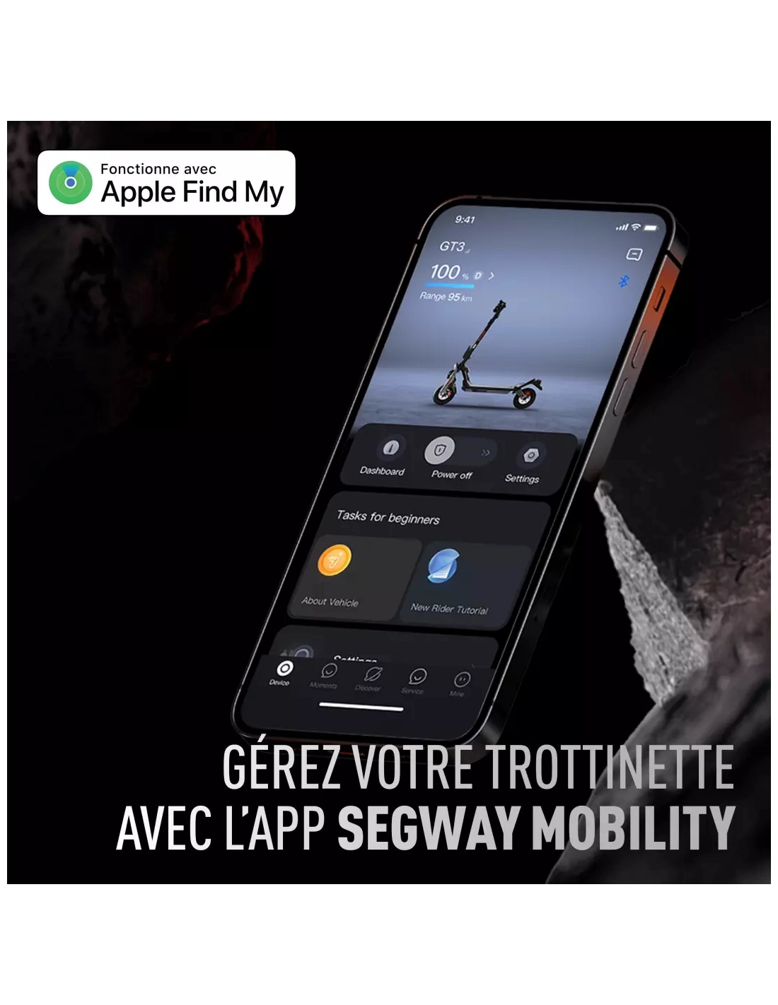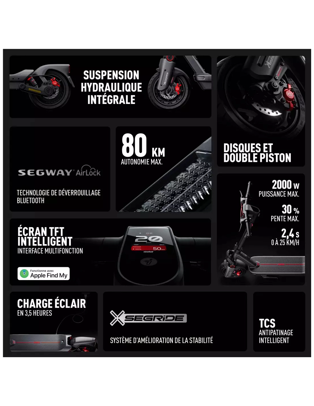 | Autres fonction(s) | système de gestion de la batterie BMS 2.0, Flash Charge (2.5 avec la charge double entrée), 3 modes de conduite (Eco, Drive, Sport), Mode Boost + mode Marche, Fonction AirLock (Déverrouille votre trottinette en fonction de votre proximité), Mocalisez la trottinette grâce à son intégration au réseau Apple Find My (Nécessite un appareil iOS) |