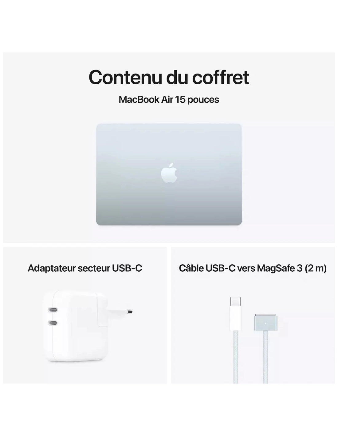 | Accessoire(s) inclus | Adaptateur secteur double port USB-C 35 W, Câble USB-C vers MagSafe 3 (2m) |