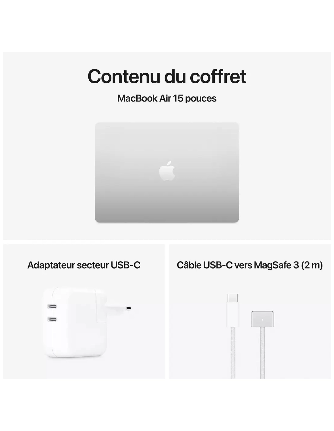 | Accessoire(s) inclus | Adaptateur d'alimentation USB-C, Câble de charge USB-C vers MagSafe 3 (2m) |