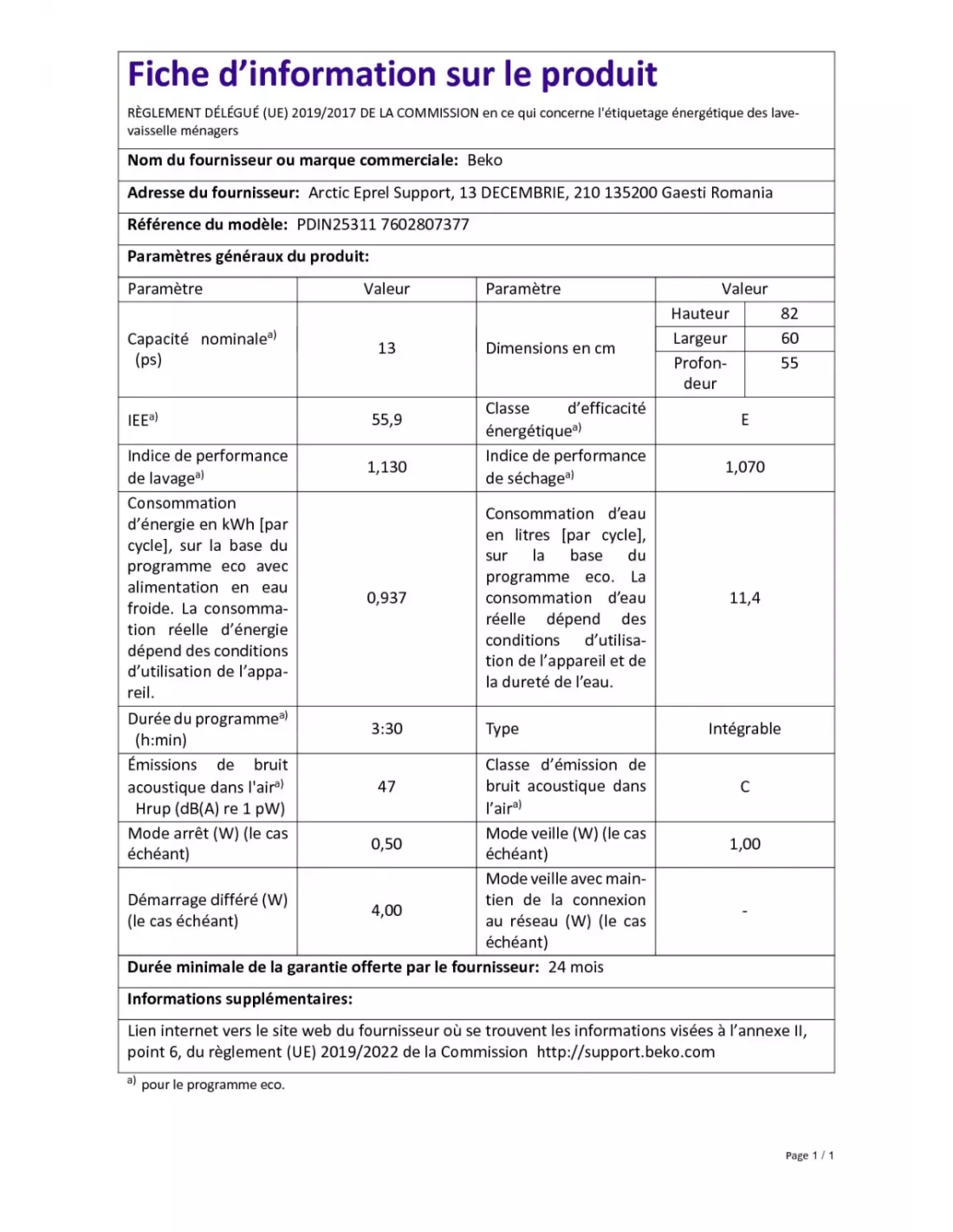 | Conso. d'énergie par cycle en programme éco (kWh) | 0.937 |