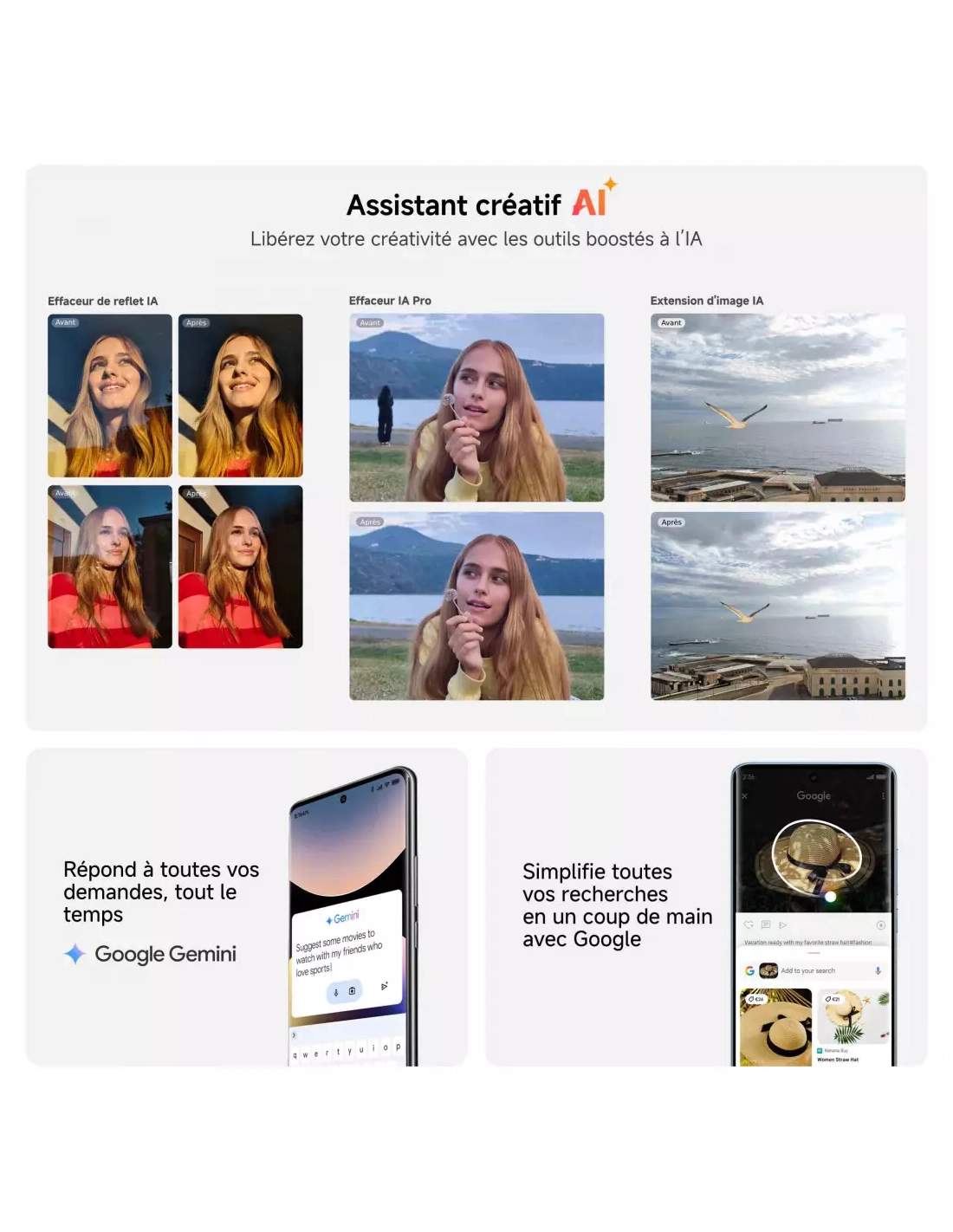 | Autre(s) fonction(s) | IA Photo Pro : Gomme Pro, Etendre, Reflet, Ciel, Bokeh, Embellissement, Film, Google Gemini, Circle to search avec Google |