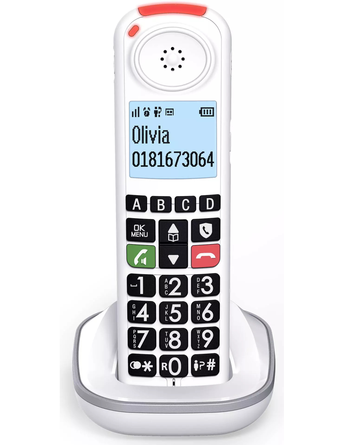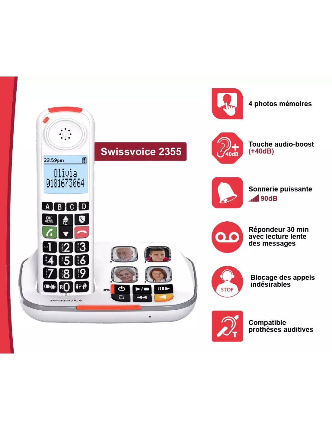 | Autre(s) fonction(s) | Touche dédiée blocage des appels, 4 mémoires directes (avec photos sur la base et touches A, B, C, D sur le combiné), Enoncé vocal des chiffres composés |