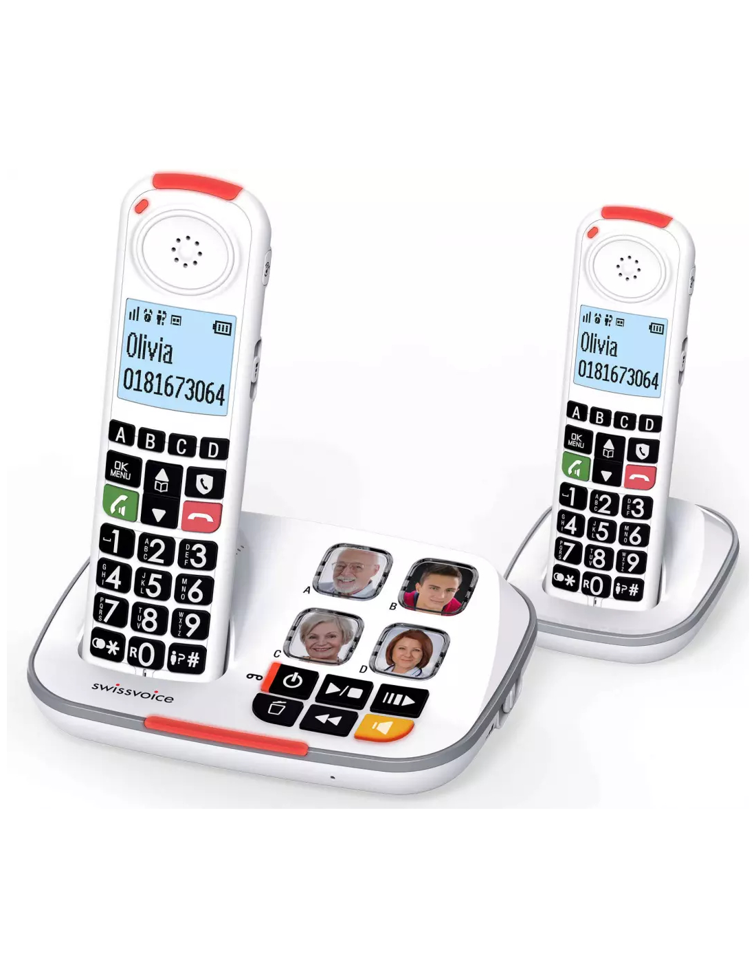| Autre(s) fonction(s) | Touche dédiée blocage des appels, 4 mémoires directes (avec photos sur la base et touches A, B, C, D sur le combiné), Enoncé vocal des chiffres composés |