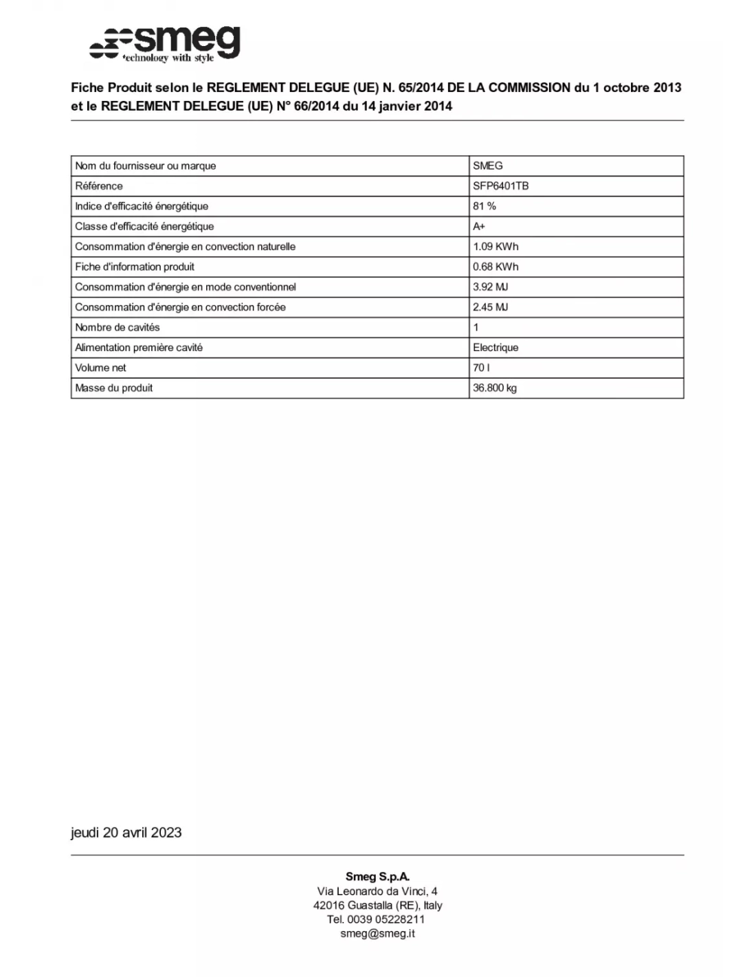 | Classe d'efficacité énergétique cavité entière | A+ |