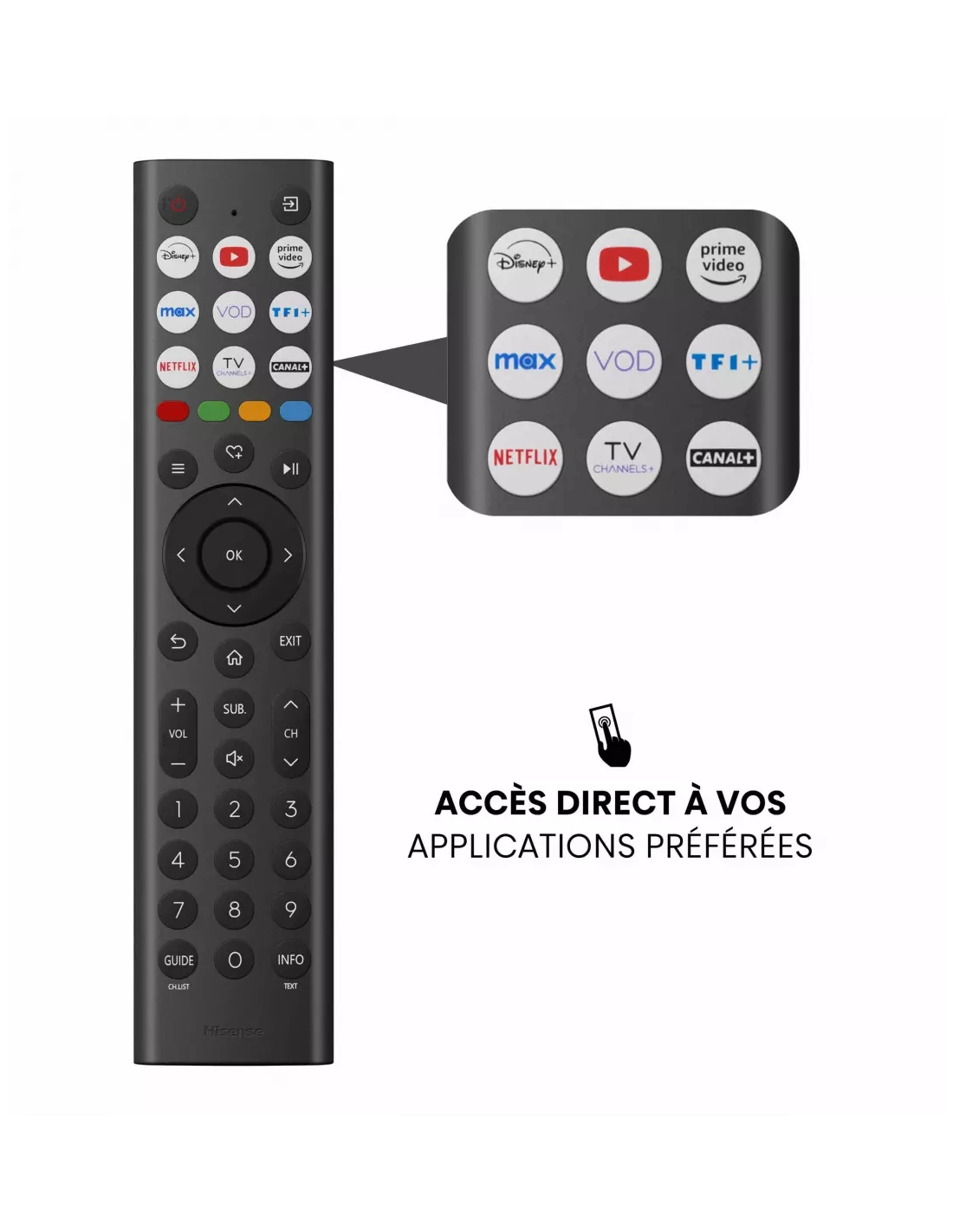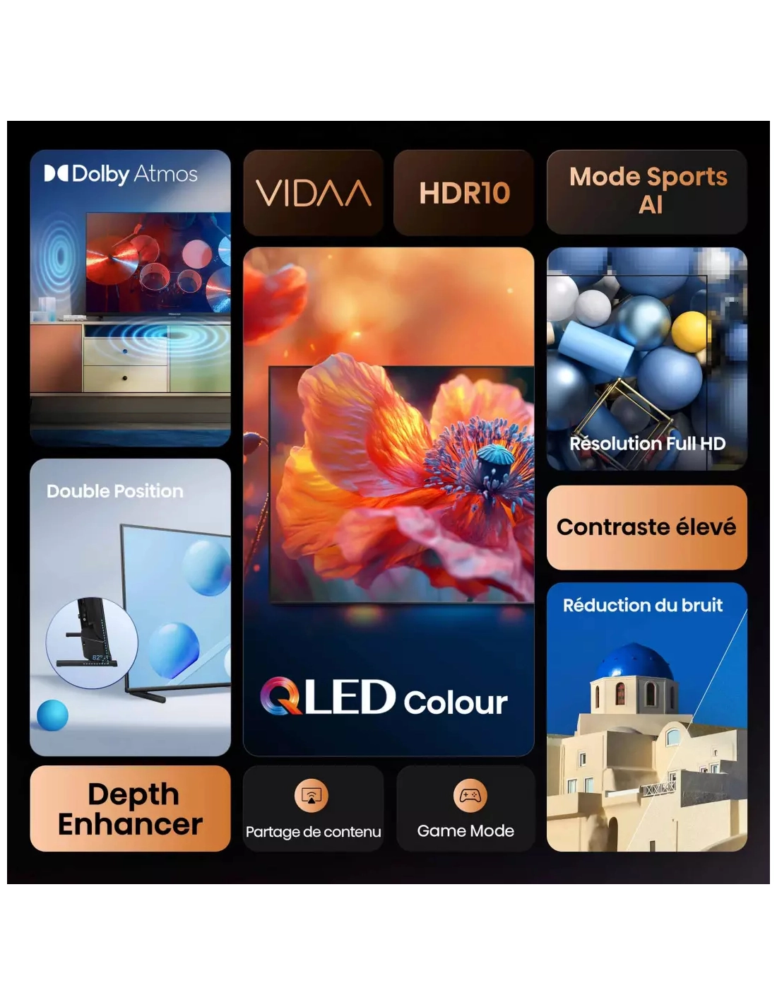 | Autre(s) fonction(s) | Contrôle vocal via télécommande, Navigateur internet, Lecteur multimédia, AirPlay, Partage d'écran, Magasin d'applications, Mode d'image automatique via IA, Vidaa ART, Applications en accès direct sur la télécommande |