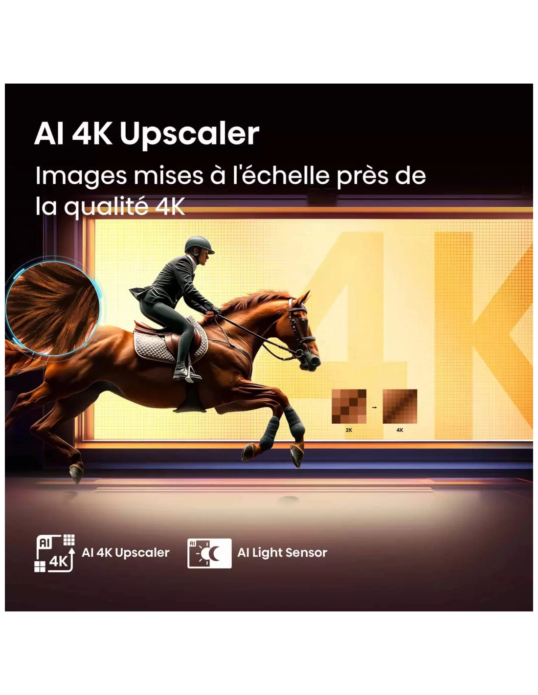 | Amélioration de l'image | Capteur de luminosité, Compensation de mouvement, Upscaling Ultra HD, Spectre Colorimètre Elargi, Quantum Dot (QLED), Mode Cinéma, Mode Filmmaker, Mode Sport, Mode jeu |