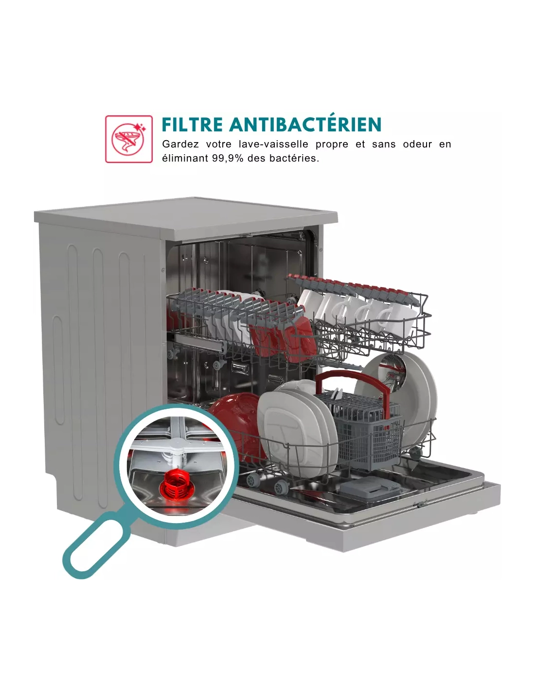 | Autre(s) équipement(s) | Filtre antibactérien, 2 bras gicleurs, 4 supports à tasses ajustables |