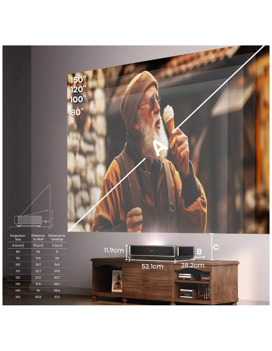 | Taille image projetée | 80'' - 150'' |