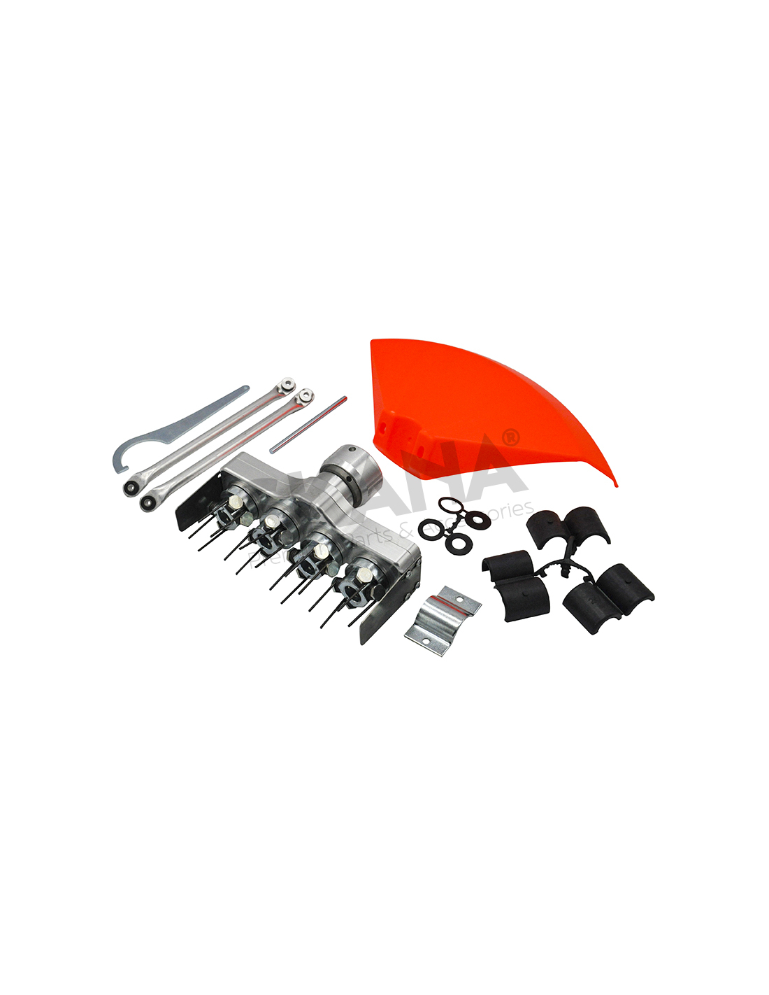 système 4 têtes émousseur contre-rotatives universel top keeper. adaptable sur toute débroussailleuse à dos avec bras droit. pou