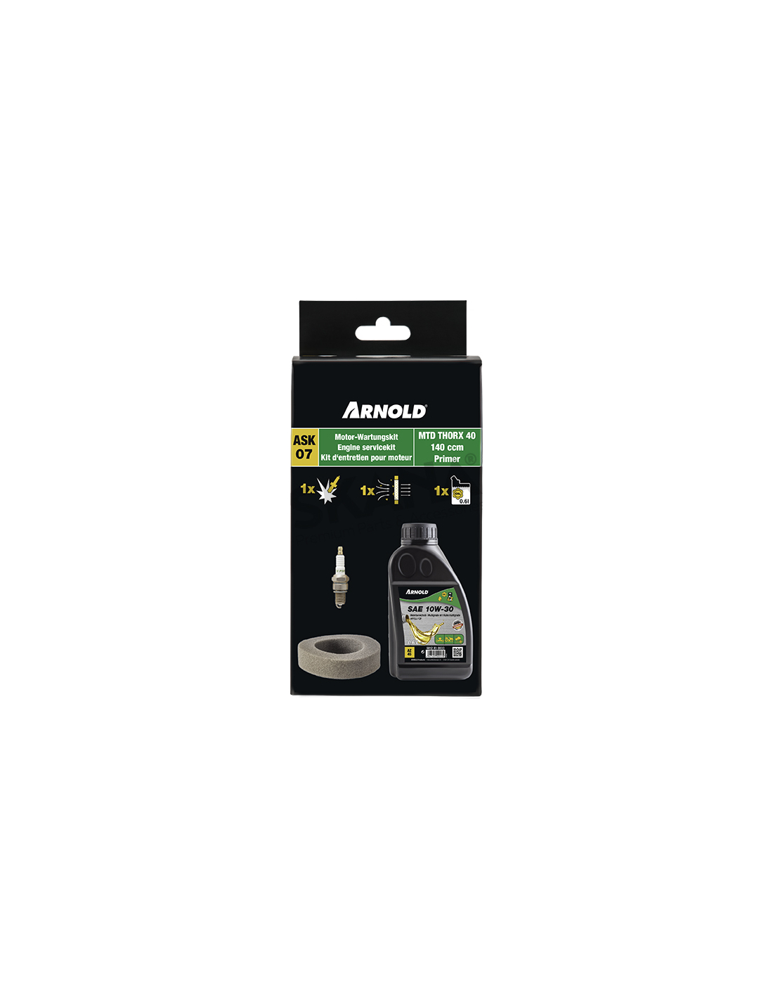 kit entretien tondeuse arnold. pour moteurs mtd thorx 45 ( 140 cc, avec poire d'amorçage ). composé de : 1 bidon d'huile sae 10w
