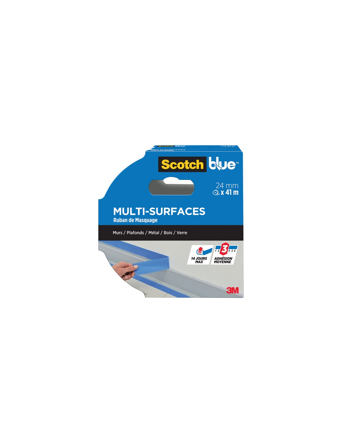 Rubans adhésifs masquage Le ruban de masquage multi-surfaces murs/plafonds/métal/bois/verre 24 mm x 41 m bleu de chez 3M s'enlève sans traces jusqu'à 14 jours après application, résistant aux UV, adhésion moyenne. Peut être utilisé sur de multiples surfaces, résultats professionnels. Le ruban de masquage est fabriqué à partir de papier certifié PEFC, dont les forêts sont gérées de façon soutenable et responsable. Ruban fabriqué avec 45% de ressources renouvelables. Papier composé de matériaux à 99% biosourcés. Adhésif sans solvant. Grande polyvalence aussi bien à l'intérieur qu'à l'extérieur. Facile à découper à la main. Idéal pour les murs, les plafonds, le métal, le bois et le verre. Conseils d'application : pour garantir les meilleurs résultats pour votre peinture, assurez-vous que la surface à peindre est propre, sèche et sans poussière afin que le ruban adhésif y adhère correctement. Ensuite, appliquez le ruban adhésif sur la surface, tout en appuyant fermement et régulièrement au fur et à mesure de l'application. Enfin, patientez une fois le ruban adhésif posé pendant 30 à 60 minutes avant de peindre. Conseils de retrait : Attendez que la peinture soit sèche au toucher avant de retirer le ruban adhésif. Enlevez le ruban en le tirant lentement vers l'arrière, en le retirant avec un angle de 45 degrés.