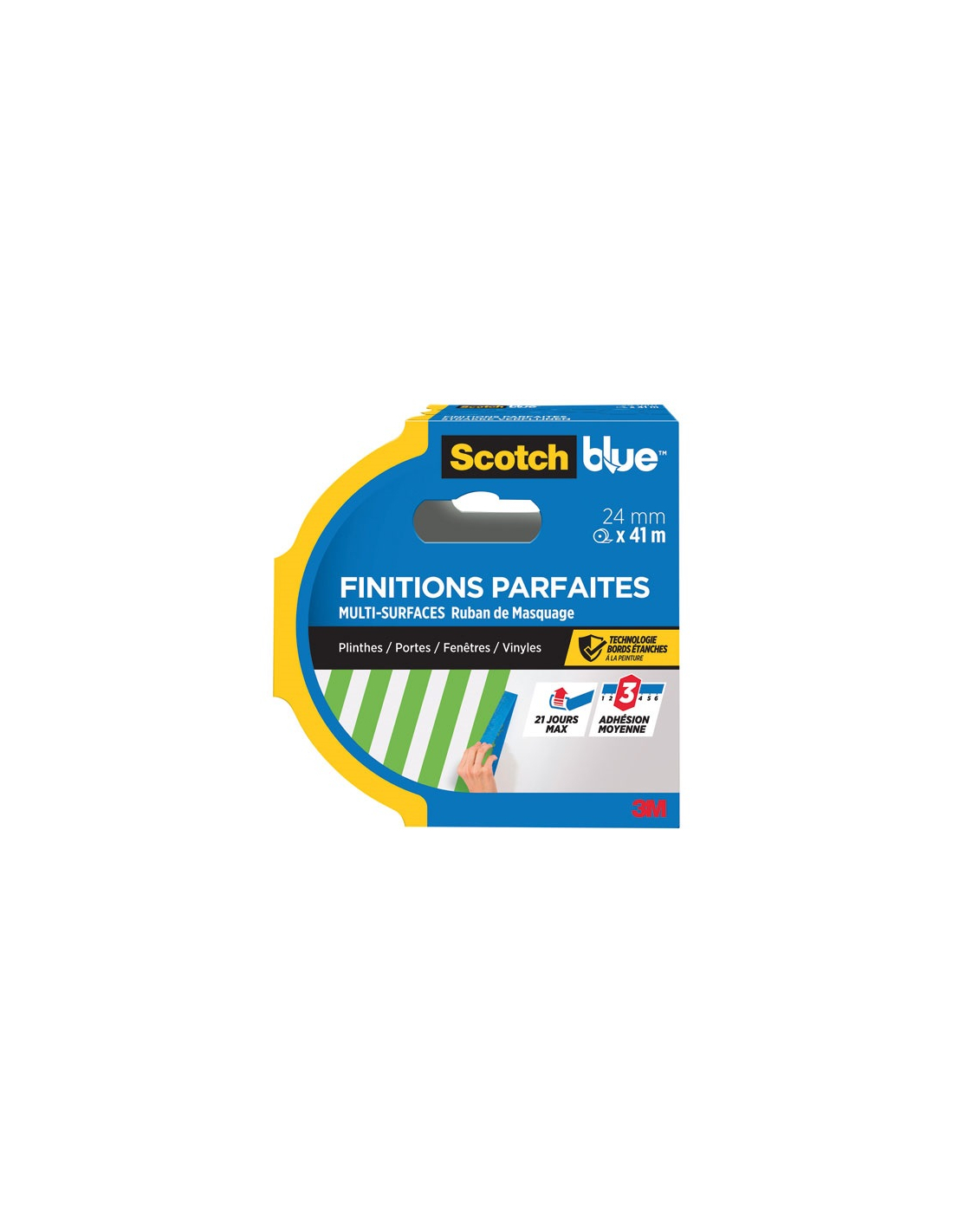 Rubans adhésifs masquage Le ruban de masquage multi-surfaces finitions parfaites plinthes/portes/fenêtres/vyniles 24 mm x 41m bleu de chez 3M est conçu pour des lignes de peinture parfaites et résultats professionnels avec la technologie avancée 3M, le ruban s'enlève sans traces jusqu'à 21 jours après l'application, adhésion moyenne. Grande polyvalence aussi bien à l'intérieur qu'à l'extérieur. Résistant aux UV. Développement durable: Fabriqué à partir de papier 100 % PEFC, contenant 40 % de ressources renouvelables, avec un adhésif sans solvant et un mandrin composé à 70 % de matières issues de déchets post-consommation. Facile à découper à la main. Indiqué pour les murs, les portes, les fenêtres, les plinthes et le vinyle. Conseils d'application: Pour garantir les meilleurs résultats pour votre peinture, assurez-vous que la surface à peindre est propre, sèche et sans poussière afin que le ruban adhésif y adhère correctement. Ensuite, appliquez le ruban adhésif sur la surface, tout en appuyant fermement et régulièrement au fur et à mesure de l'application. Enfin, patientez une fois le ruban adhésif posé pendant 30 à 60 minutes avant de peindre. Conseils de retrait : Attendez que la peinture soit sèche au toucher avant de retirer le ruban adhésif. Enlevez le ruban en le tirant lentement vers l'arrière, en le retirant avec un angle de 45 degrés. Permet de masquer avec précision les surfaces comme les murs, les portes, les fenêtres, les plinthes et le vinyle pendant les travaux de peinture et décoration.