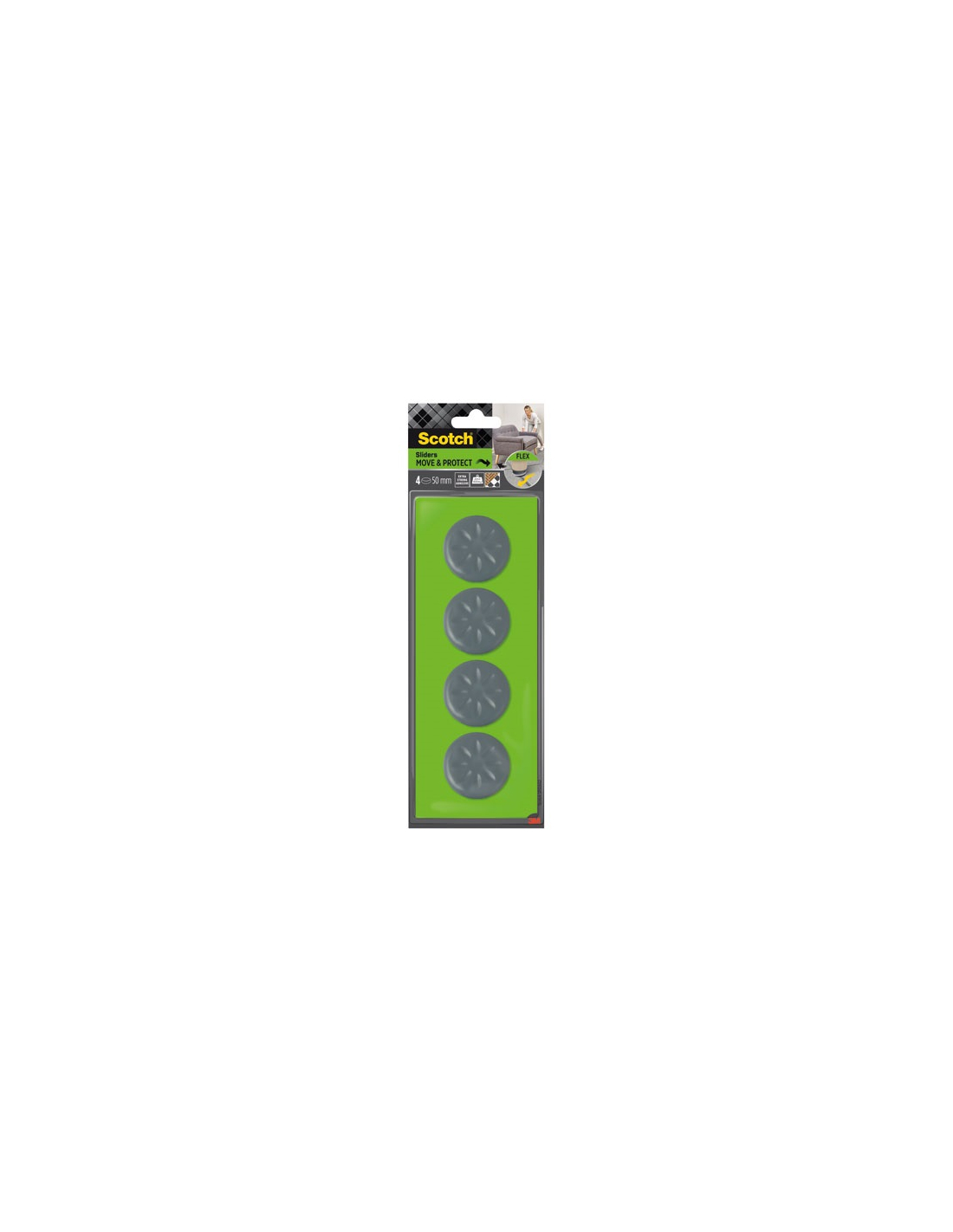 Embouts de chaise & patins Le patin glisseur adhésif rond à alvéoles diamètre 50 mm coloris gris lot de 4 de chez 3M est adapté à la fixation permanente et facilitent le déplacement de meubles et d'appareils, notamment sur les planchers irréguliers. Ils présentent une structure flexible avec une articulation à bille et une mousse uniques qui permet de faire aisément glisser le mobilier sur les surfaces inégales. Pourvus d'un adhésif solide et permanent, ils sont fabriqués en polymère avec une surface alvéolée qui permet de déplacer les meubles jusqu'à 700 kg. Ils sont disponibles dans différentes formes et tailles. Réagencez votre mobilier en toute simplicité, notamment sur des sols inégaux avec les patins glisseurs adhésifs Move & Protect Flex Scotch®. Si vous recevez souvent ou réinventez continuellement votre espace, ces patins glisseurs vous permettent de déplacer vos meubles d’un endroit à l’autre en un clin d’œil. Ils présentent une structure flexible avec une articulation à bille et une mousse uniques qui aide à faire glisser aisément vos meubles, même sur des sols inégaux. Il suffit de les poser sur les pieds de vos lits, fauteuils et canapés, commodes, écrans de télévision, etc. Pourvus d'un adhésif solide et permanent, ils sont fabriqués en polymère avec une surface alvéolée afin de déplacer des meubles jusqu'à 700 kg sans effort et sans endommager vos sols. Ils sont disponibles dans différentes formes et tailles.