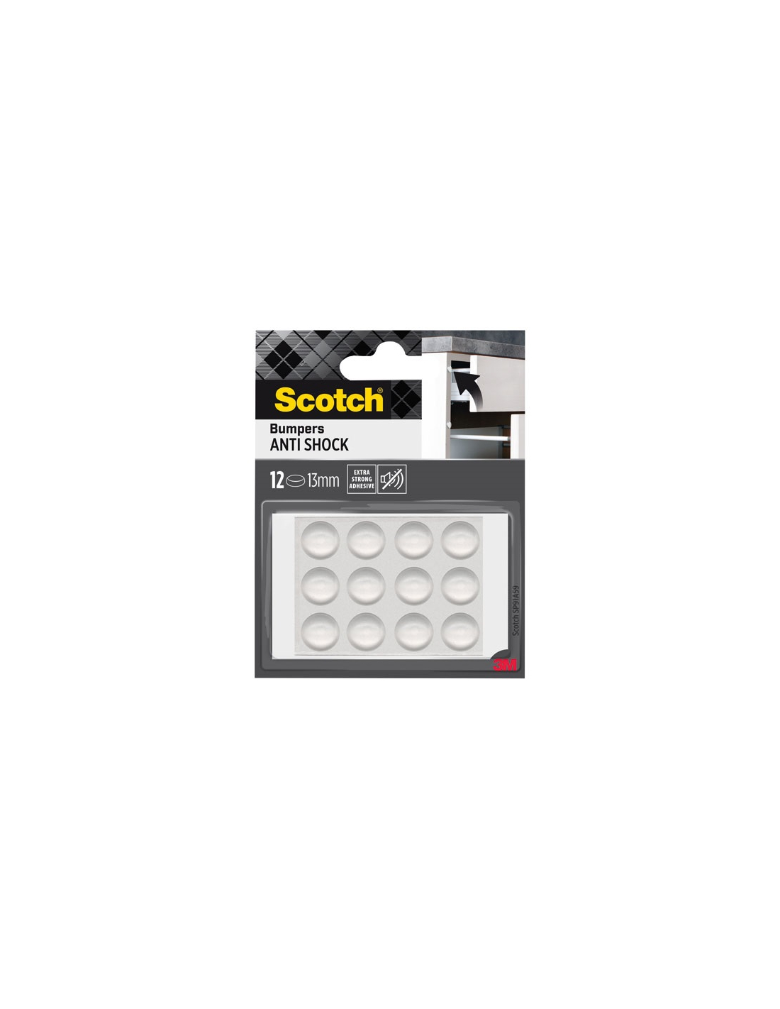 Embouts de chaise & patins La butée adhésive patin antichoc anti-bruit diamètre 12 mm coloris transparent lot de 12 de chez 3M est une pastille de protection en élastomère élastique permanent de qualité pourvues d'un adhésif extra-fort. Ils sont conçus pour protéger les tiroirs et les portes d'armoires contre les claquements, les petits appareils des rayures, du glissements et des vibrations de tout ce qui fait du bruit. Ils ne laissent ni rayure ni tache sur la surface, ne se fissurent pas et ne durcissent pas : une solution idéale sur le long terme. Ils sont proposés dans différentes couleurs et tailles. Amortissez les chocs grâce au pouvoir silencieux des butoirs anti-chocs adhésifs Scotch®. Ces butoirs discrets sont conçus pour réduire les impacts et absorber le bruit. Ils sont composés d'un élastomère élastique permanent de haute qualité et d'un adhésif extra-fort. La solution idéale pour empêcher les tiroirs et les portes d'armoires de claquer et les petits appareils, de rayer les surfaces, glisser et vibrer. Ils ne laissent ni rayure ni tache sur la surface, ne se fissurent pas et ne durcissent pas. Grâce à ces propriétés, les butoirs sont la solution idéale pour protéger du bruit, des vibrations et des chocs sur le long terme. Ils sont proposés dans différentes couleurs et tailles.