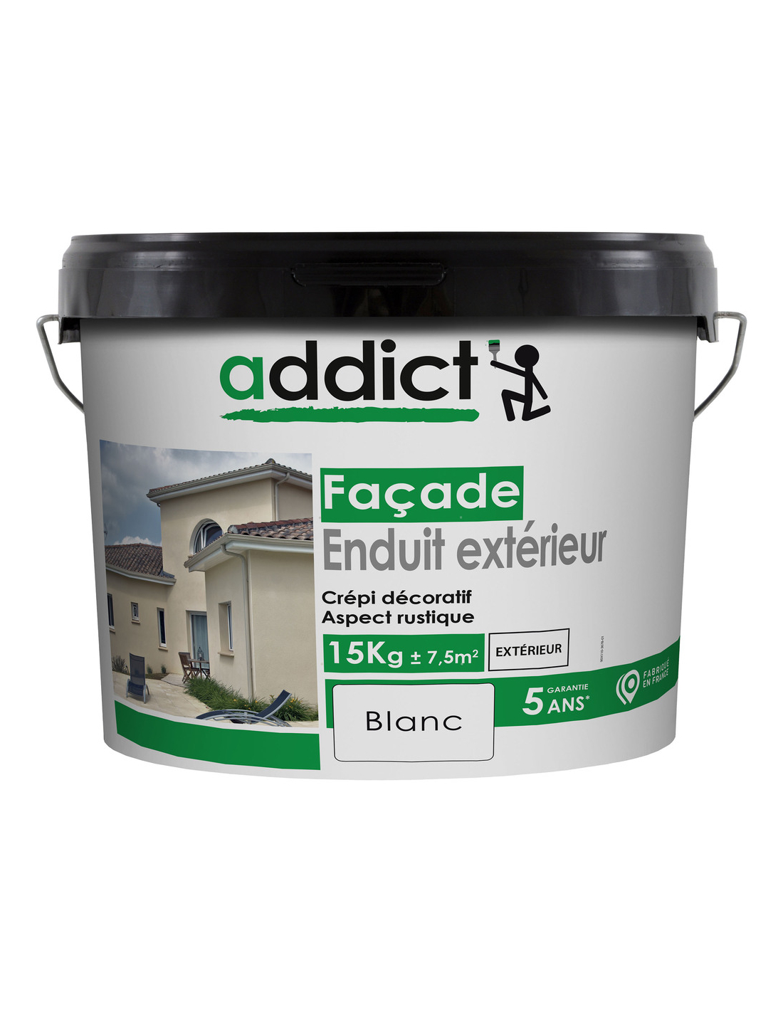 ?, Grande facilité d’application?, Microporeux.?, Sans odeur. Aspect du film : Mat.Brillant spéculaire Inférieur à 5 sous 60°.Teinte : blancConditionnement : 15 Kg. Séchage (à 23°C, H.R. : 50 %)?, Sec : 24 heures.?, Sec hors d’eau : 72 heures.?, Séchage optimal : 10 jours. Conservation du Crépi Façade Blanc Addict :?, En emballage d’origine (non ouvert) : 24 mois. Marque : ADDICT Fournisseur : RECA PEINTURES DEEE : 0.0000 €Peintures Peintures extérieures Peintures spécifiques Peintures intérieures Aérosols Bases et colorants machines Produits complémentaires > Peintures extérieures Peintures façades Peintures bois Peintures toitures Peintures fers et métaux > Peintures façades Façades Crépis > Enduit Extérieur Aspect Crépi Blanc 15KG