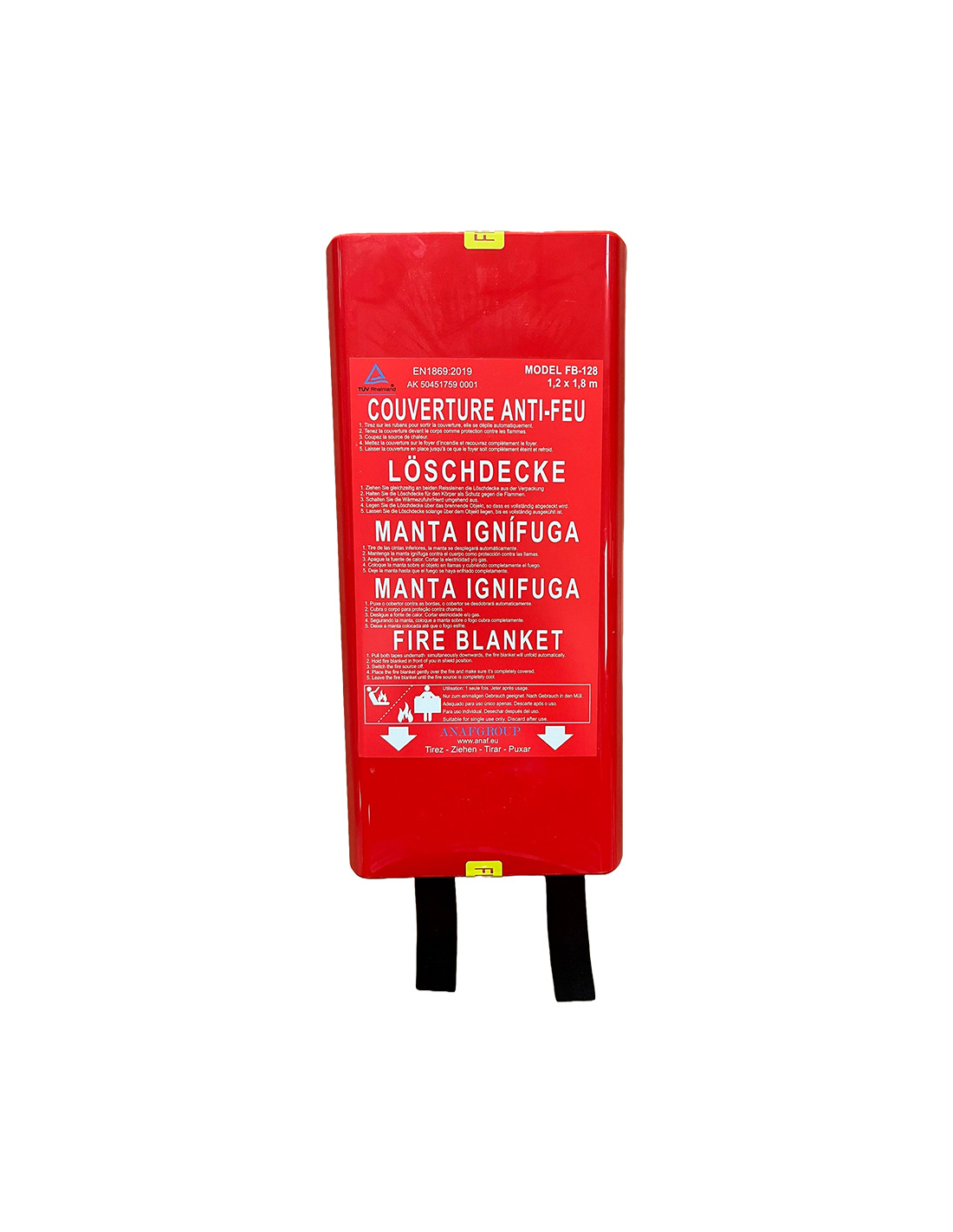 couverture antifeu fb-128, en boîtier rigide, 5 langues, 120 x 180 cm