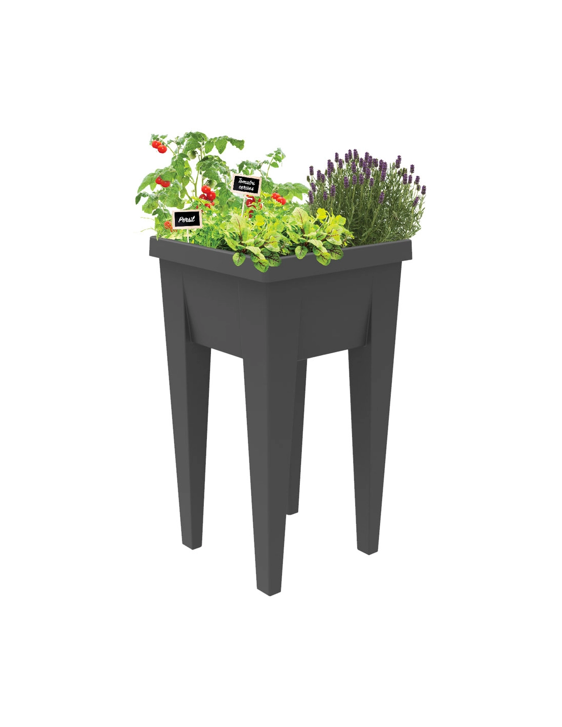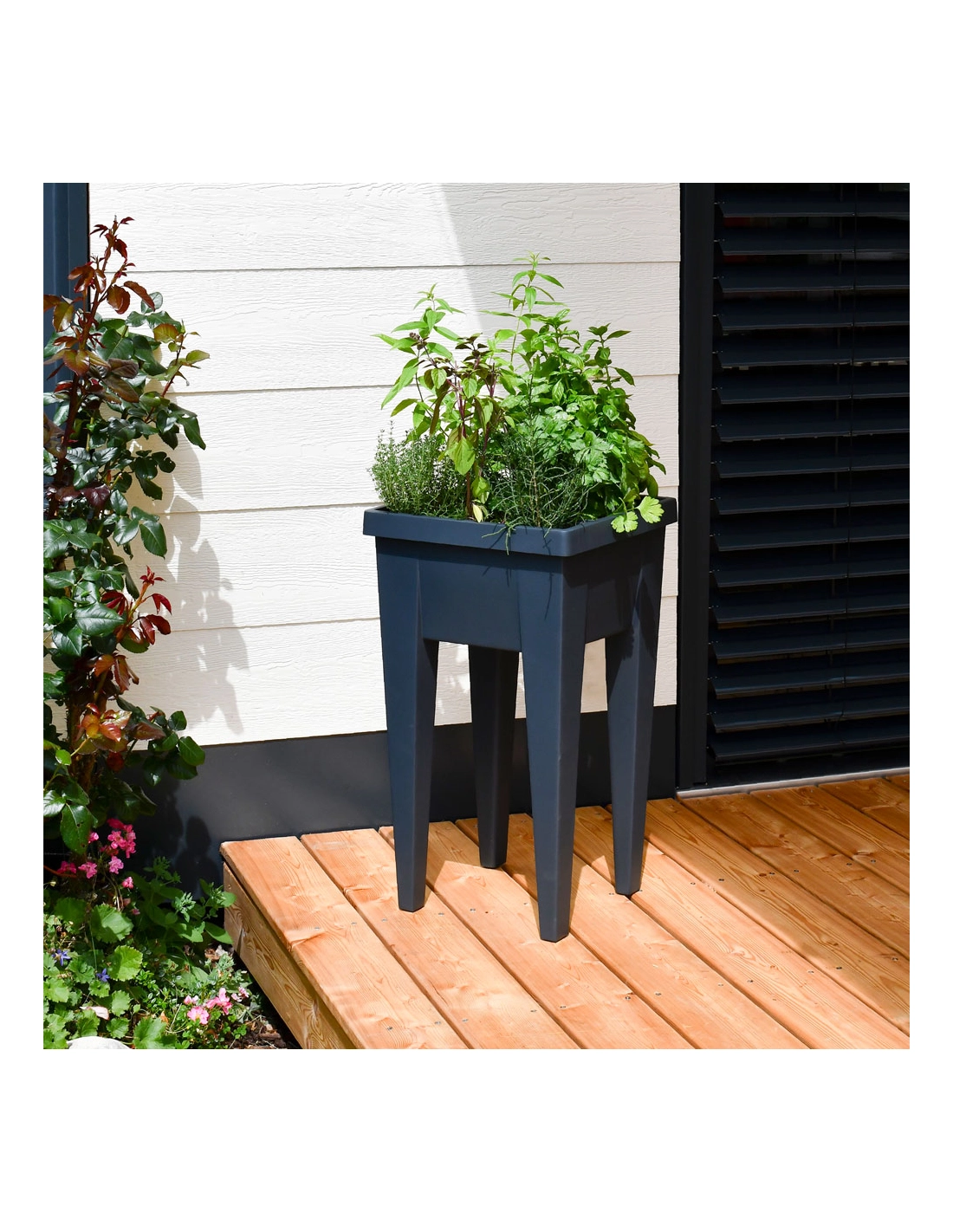 Sa conception sur pieds offre une hauteur confortable pour jardiner sans se pencher, tandis que son design anthracite moderne s’intègre parfaitement aux terrasses, balcons ou jardins urbains.