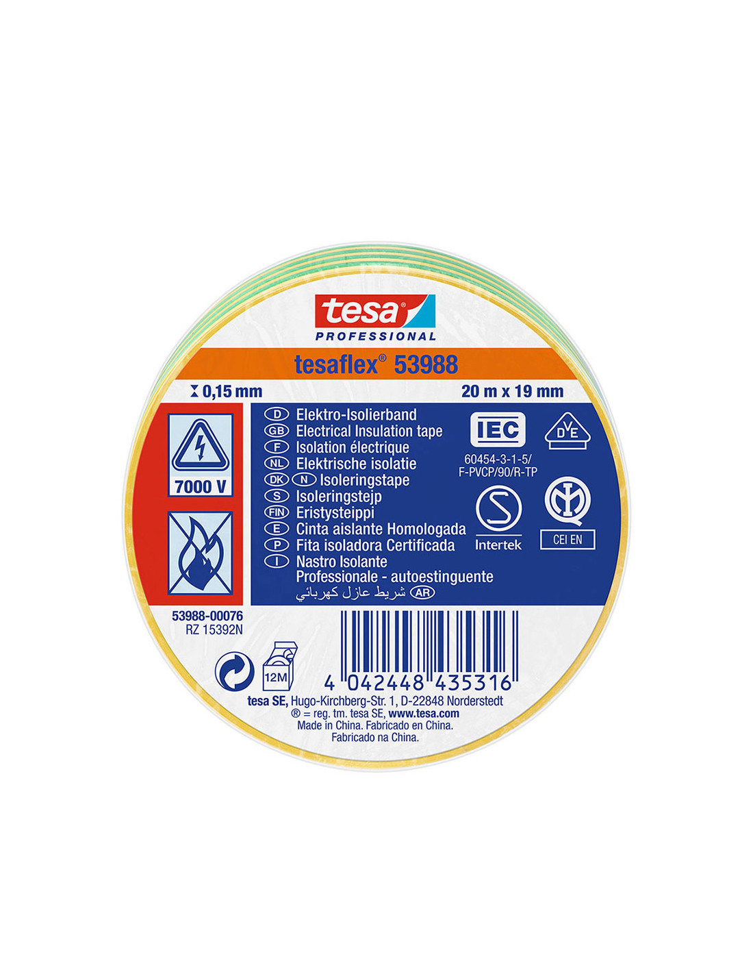 10 Ruban Isolant Homologué Bicolore 20m X 19mm 53988 Tesa