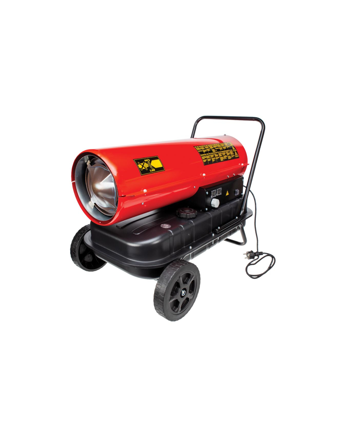 Maison & intérieur Climat Chauffage Chauffages - Bois & Combustible Caractéristiques physiques: •• Longueur du câble: 1.25 m •• Couleurs primaires: Rouge •• Couleurs supplémentaires: Noir •• Profondeur du produit: 47 cm •• Hauteur du produit: 58.8 cm •• Largeur du produit: 85.5 cm •• Poids Produit: 19.2 kg •• Matériau: Acier inoxydable •• Largeur du chauffage: 820 mm • Propriétés électriques: •• Indice IP: IPX4 •• Fréquence d'entrée nominale: 50 Hz •• Puissance nominale: 30 kW •• Consommation électrique pouvoir: 230 W •• Tension d'entrée minimale nominale VAC: 220 V •• Tension d'entrée maximale nominale VAC: 240 V • Caractéristiques fonctionnelles: •• Mode thermostat: Manuel • Caractéristiques techniques et performances: •• Consommation de carburant des chauffages diesel: 2.8 l/h •• Surface de chauffe maximale: 420 m² •• Zone de chauffe minimale: 320 m² •• Protection: Réservoir vide,Flamme,Thermique •• Lieu d'utilisation: Intérieur et extérieur •• Avec poignées: Oui •• Avec roues: Oui •• Débit d'air: 750 m³/h •• Puissance calorifique du canon: 102.360 BTU/h •• Affichage: Oui •• Chauffe-diamètre: 230 mm •• Affichage de l'huile: Oui •• Capacité du réservoir de carburant: 38 l •• Type de combustible: Diesel/kérosène • Installation et montage: •• Type de prise secteur: Type E/F (France/Allemagne) •• Langues du manuel d'instructions: néerlandais,anglais,français,allemand,polonais,portugais,espagnol • Environnement et durabilité: •• Etiquette énergétique: A